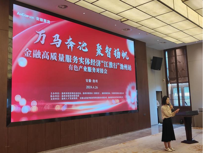 本次會(huì)議由池州市經(jīng)濟(jì)信息化局、池州市財(cái)政局(國資委)、池州市商務(wù)局、安糧期貨股份有限公司主辦,池州市投資控股集團(tuán)協(xié)辦,安徽友進(jìn)冠華新材料科技股份有限公司、池州建投商業(yè)發(fā)展有限公司提供支持,邀請(qǐng)了池州市鎂鋁銅相關(guān)企業(yè)及多家金融機(jī)構(gòu)代表參會(huì)。池州市商務(wù)局黨組書記、局長李進(jìn)出席活動(dòng),池州市經(jīng)濟(jì)與信息化局副局長朱宇、安糧期貨董事長韓文輝先后致辭。