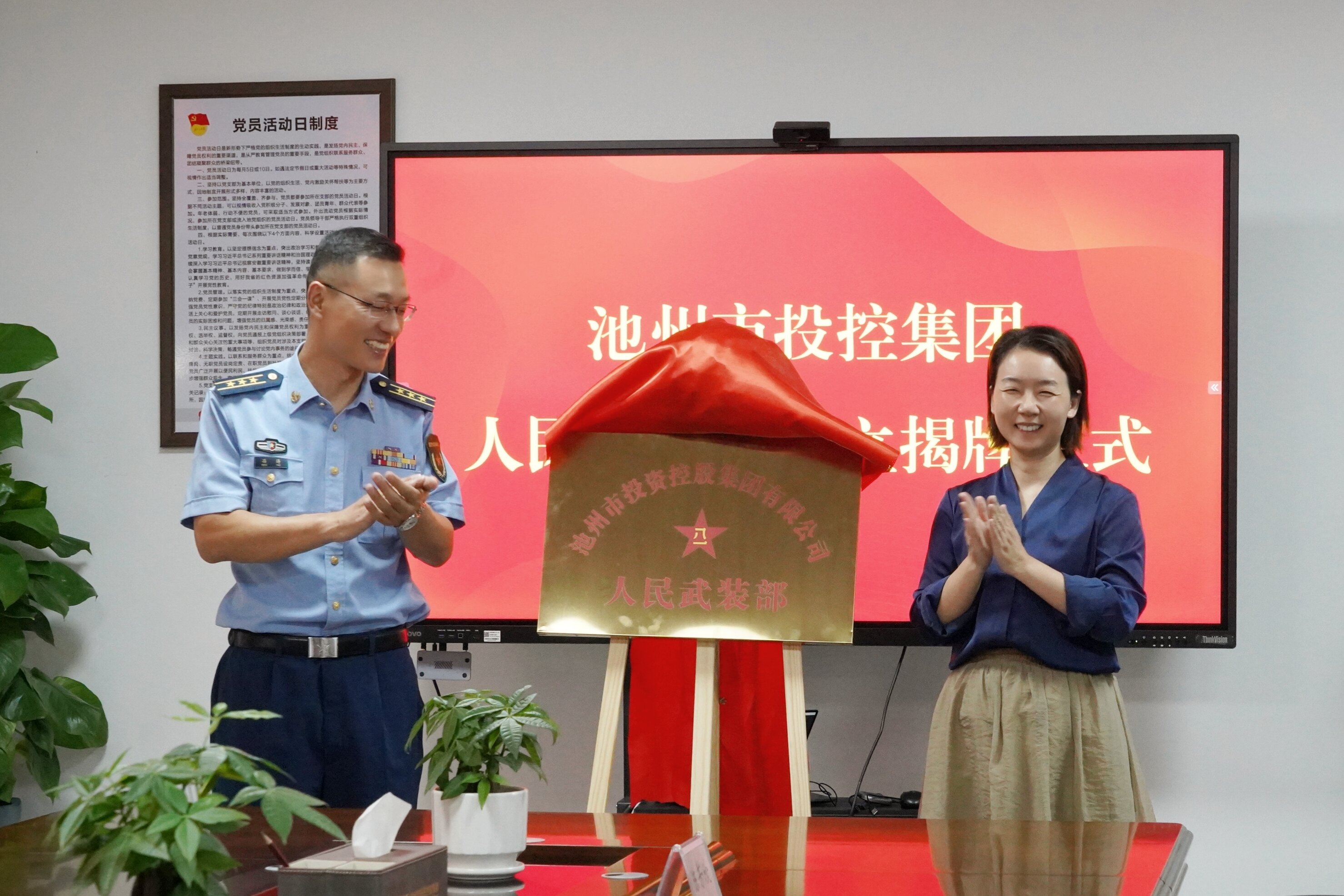 7月31日上午,池州市投資控股集團有限公司舉行人民武裝部成立揭牌儀式,貴池區(qū)委常委、區(qū)人武部政委馮濤與集團黨委副書記、工會主席嚴艷共同為集團人民武裝部揭牌。集團總經理助理、黨群工作部經理汪興安等參加活動。